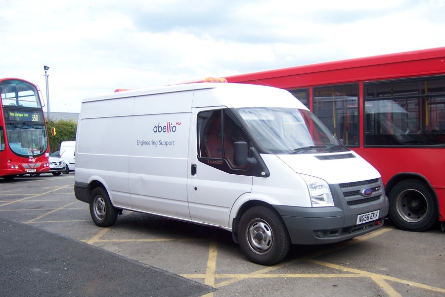 Details: Additions to the service vehicle fleet of Abellio have started a new fleet numbering sequence at 6101, instead of the 89xx series used by Travel London. However, like Travel London, the numbers appear to be allocated on paper only. Ford Transit van NG56EKV was found parked at Hayes garage on 15th May 2010 with company names and 'Engineering Support' titling. It did not appear on a fleetlist earlier that month so must have been a very recent addition. This does mean that we don't know its number of course... Hayes is one of the smallest garages in London, with a peak run out of 28 buses. This includes just one double-decker, used on school journeys on route 350. At other times, Volvo B7TL 9066 (visible in the background here) sits in the garage yard. |