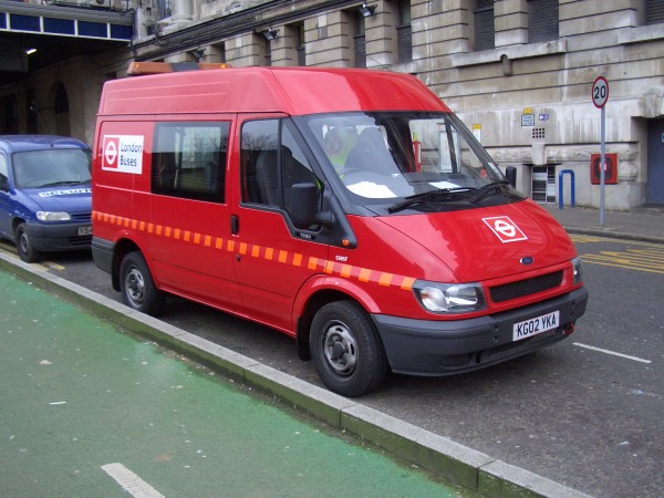 Details: A type of vehicle that is gaining popularity as a service vehicle is the Crew Van. This is a cross between a minibus and a van, with a row of seats behind the driver, and a freight compartment behind that. The mesh screen separating the two sections can be seen in this view of Ford Transit T280 5365F (KG02YKA), in use with the Passenger Data department and pictured at Waterloo Station on Monday 26th January 2004. Note that, unlike the minibuses used by this department (such as 5017F and 5427F), this vehicle carries flashing roof lights. |