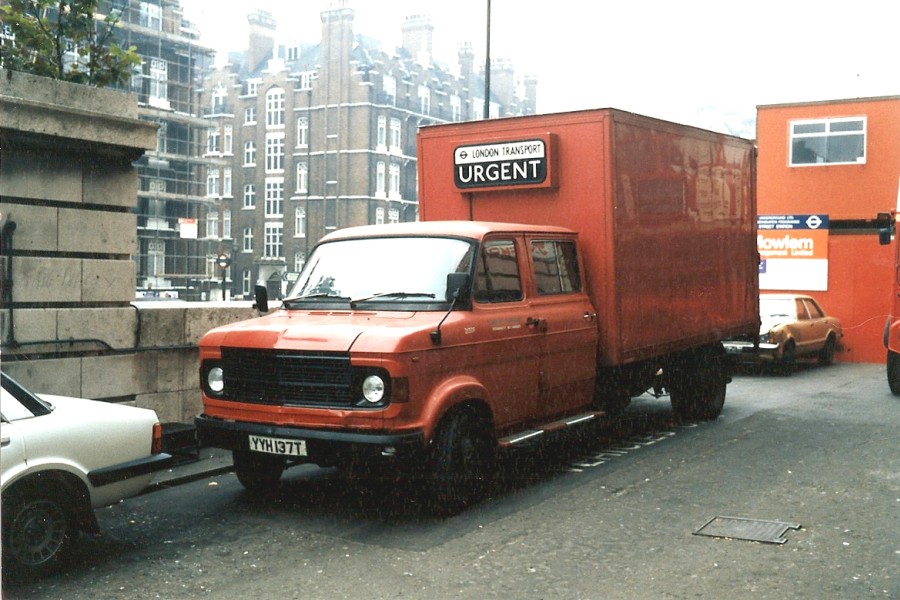 Details: In 1979 the Permanent Way Engineers took delivery of four Ford A0609 box trucks for use as emergency vehicles (hence the red livery). They were allocated to Lillie Bridge (2), Whitechapel and Baker Street, replacing Leyland Titans such as 1275LD. The allocations seem to have been rotated at times. Among the relatively few photographs of these vehicles in my collection are one each of 2135F, 2136F and 2137F (seen here on 5th October 1986) at Baker Street. 2138F was a shorter wheelbase vehicle, which I have never seen a photograph of. According to my notebooks, I did see all four vehicles, but I was a mere lad whose interest didn't go far beyond underlining numbers in the books! |