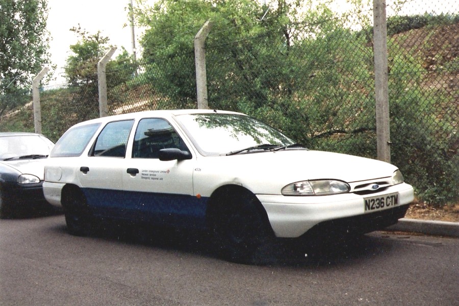 Details: As well as the trucks, the Emergency Response Unit has also regularly featured at least one car in recent years, presumably for use by the 'boss'. Between 1995 and 1998 this vehicle was 4536F, a Ford Mondeo estate, eventually replaced by very similar 4913F. Note the 'unfinished' looking livery (with white bumpers), the lack of suffix on the fleetnumber, and the side lettering that reads ' London Underground Limited, Network services, Emergency response unit'. It was photographed at the RAF Museum in Hendon during a display of emergency vehicles. |