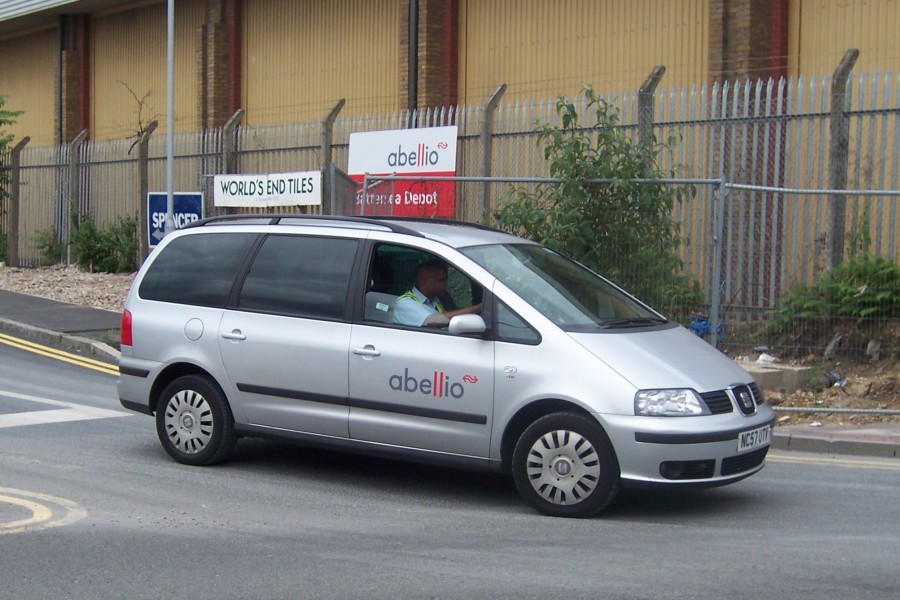Details: One more picture from Battersea on 7th June 2010. A few Seat Alhambra estate cars are the only recent additions to the Abellio fleet not to carry white livery. As this photo shows, the standard fleetname includes grey and red letters, and also features the logo of the parent company, NS (Dutch railways). |