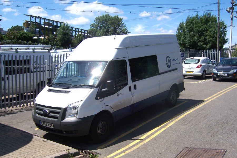 Details: 6595F is a Ford Transit high-roof crew van in the Tube Lines fleet, based initially at Stratford Market but apparently reallocated in 2009 to Finchley Central, where it was photographed on 10th July 2010. Two mid-height Transits were in the yard on the left, while on the right is the rear of rarely seen Vauxhall Corsa van 6710V. |