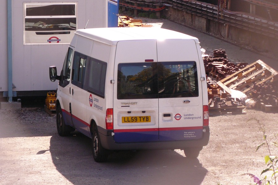 Details: The vehicles to be found in the yard alongside West Kensington Station (which we treat as part of the Lillie Bridge complex) have changed several times over recent years. Having been host to groups of Ford Rangers then Vauxhall Combos, the use of the location seems to have declined somewhat. The portable buildings on site have also been reduced and rearranged. When we had a peek on 10th July 2010, just two Ford Transits were present, including 9-seat minibus 6863F. Unlike similar 6472F, based nearby in the main depot, 6863F does not have rear chevrons. |