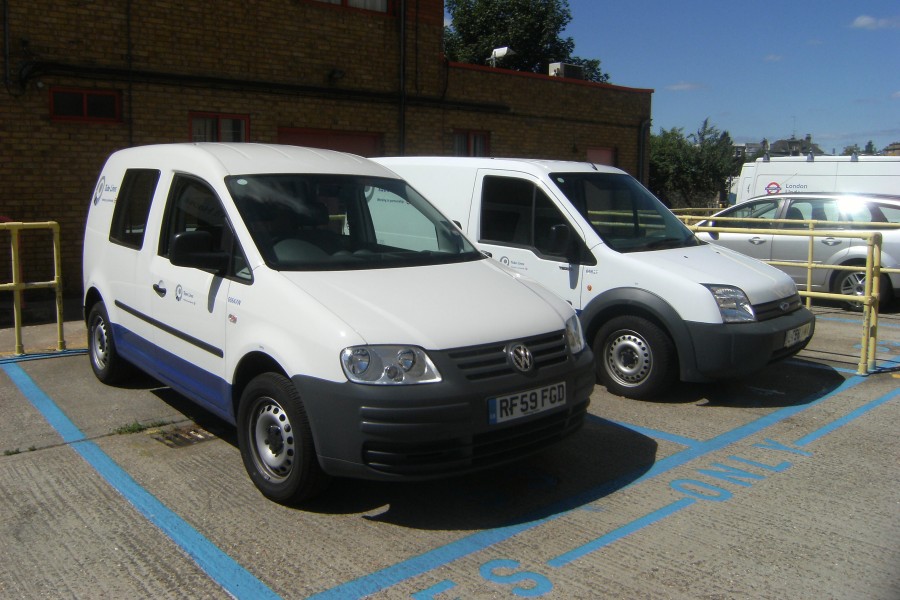 Details: The Volkswagen Caddy became more common as a service vehicle during the first half of 2010, with at least nine being leased (following from nine others leased over the previous four years). It seems to have taken over from the Ford Transit Connect as the light van of choice. Most of the new arrivals are crew vans, with a second row of seats and extra windows in both sides. As well as several at Stratford Market, one of the Tube Lines examples is based at Lillie Bridge. 6864VW was photographed at home on 4th July 2010, parked alongside Transit Connect 6662F (the similarity in size is apparent). Tube Lines are somewhat in a minority at this location, most vehicles being in the London Underground (former Metronet) fleet. Could it be that the blue markings painted on the ground read 'TUBE LINES ONLY'? |