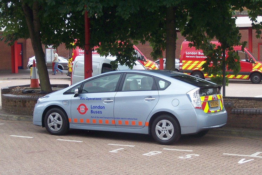 Details: More silver (blue) Toyota Priuses appeared through July 2010, this time lettered for Bus Operations, and wearing the 'orange squares' striping. They have smaller lettering that reads 'Part of the new Transport for London electric vehicle fleet', as also seen on the recent Mitsubishi i-MiEV cars. It is too early to be certain but it is possible that these are intended to replace the 16 Honda Civic cars used by LBSL Operations, which are just coming up to being three years old. The new cars do not carry fleetnumbers but neither did many of the Hondas at first. GY10UHZ was photographed at Eltham Bus Station on 23rd July, in company with a pair of IRU vans and a Renault Kangoo van of cleaning contractor Dougland.