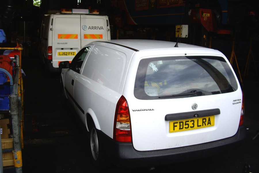 Details: Seen at Arriva Guildford and West Surrey's Guildford Garage on 17th July 2010 are two (quite possibly all) of the fleet's service vehicles. Nearest is unmarked Vauxhall Astra van FD53LRA, latterly based at Cranleigh and assigned the fleetnumber V024. Beyond is already-illustrated Ford Transit van LJ52FYZ. |