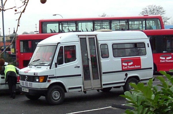 Details: East Thames Buses 105 (M27CLT) used to be part of the London Dial-a-Ride fleet, which came under London Transport control in 2002. In its current use as a crew transfer bus it is presumed that the wheelchair carrying capabilities are not often required! Pictured at Lewisham Bus Station in January 2004. |