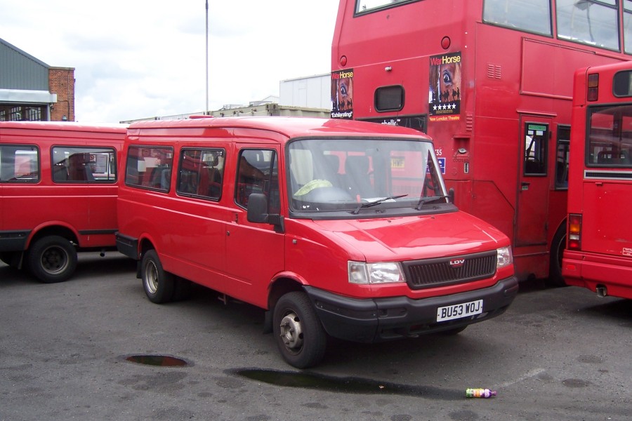 Details: The Abellio fleet includes a number of LDV Convoy minibuses acquired from the Royal Mail. Most now operate in anonymous red livery. BU53WOJ is typical of these and was photographed at Fulwell Garage on 1st August 2010 with another behind. Apart from the frontal styling, this design of vehicle has not changed much since it was launched as the Leyland Sherpa in the 1970s.