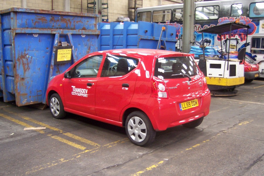 Details: Today's photo updates includes vehicles from three manufacturers that have not been represented before. The first is Suzuki, Transdev LL59DDN being an Alto 5-door hatchback car lettered for the CCTV support role (in which it might have replaced Fiesta VE04ECX). It was seen parked in its dedicated slot inside Fulwell Garage on 1st August 2010. Beyond the sweeper is Fiesta van P822HJW, while beyond that is an unidentified MCW Metrobus in an unusual livery lettered as the Youth Cafe Project bus. |
