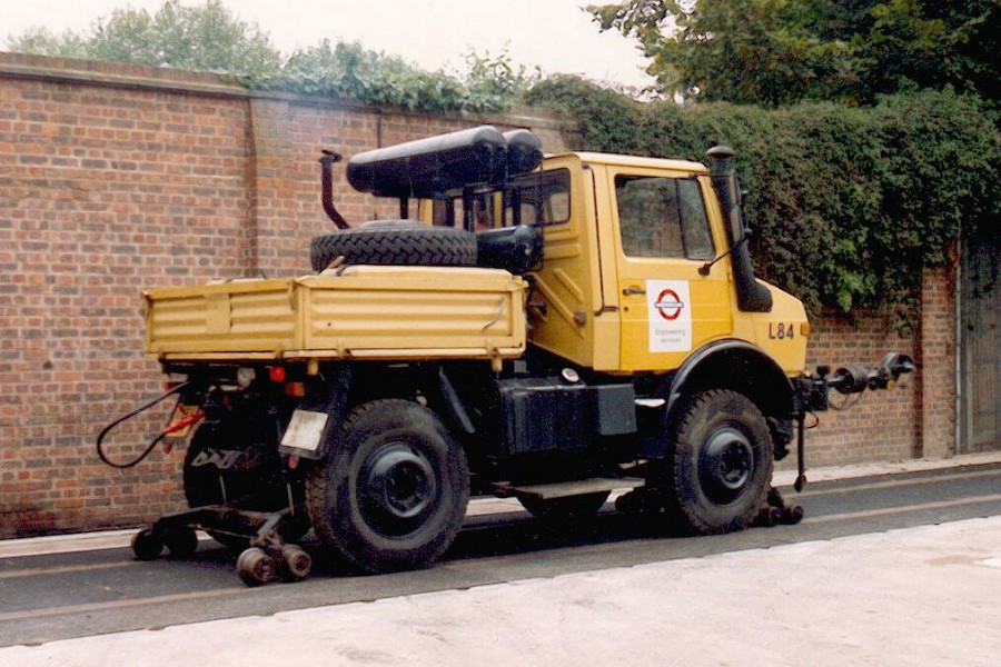 Details: Photographed in rail mode at Ealing Common depot on 25th September 1993, Unimog L84 (A456NWX) uses its road wheels to provide traction on the railheads. The tiny rail wheels are only for guidance. The large air cylinders behind the cab are thought to be to provide train braking when coupled to rail rolling stock. Both this vehicle and similar L85 (C622EWT) remain in stock in 2010 but seem to be out of use at Lillie Bridge. Which reminds me, I really must publish a photo of L85... |