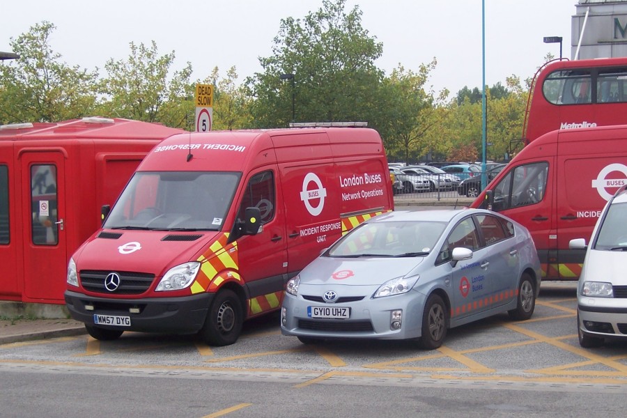 Details: Four Toyota Prius hybrid electric cars were delivered for use by London Buses in summer 2010. Three are assigned to bus operations and at present are based at Isleworth. GY10UHZ, which was sent to Eltham when new, was found parked at Edgware Bus Station on 9th October 2010 keeping a pair of IRUs company. |
