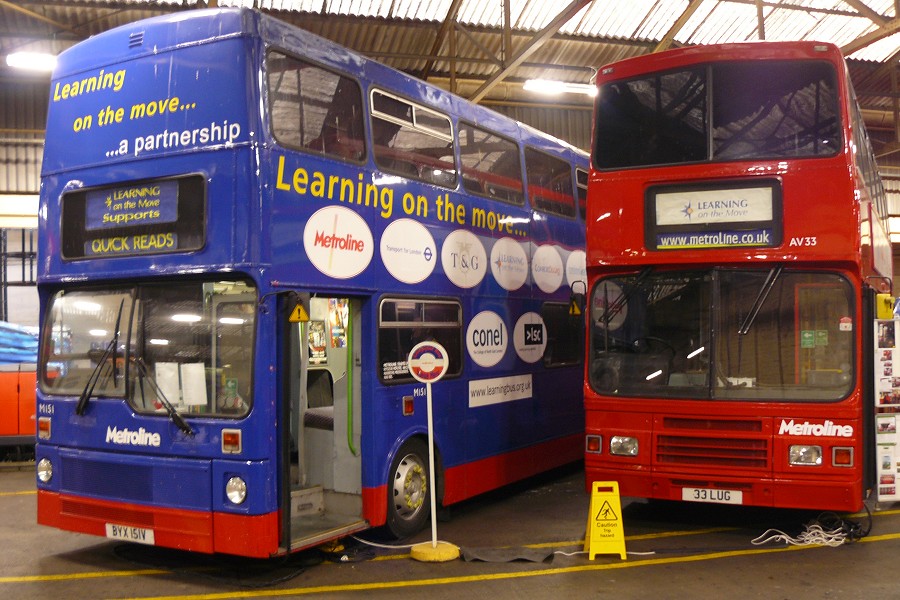 Details: Visitors to the Willesden Bus Garage open day on 9th October 2010 may have been surprised to find M151 alive and apparently well. This was the bus that was converted into a mobile IT classroom in 2002. It was nominally replaced by Olympian AV33 in 2008, the latter bus also taking over the special 33LUG registration number. M151 reverted to its original mark of BYX151V but it was not in fact licensed and has presumably been confined to Willesden Garage ever since. The reason why I have included M151 in the vehicle database and not AV33 is .... um.... |