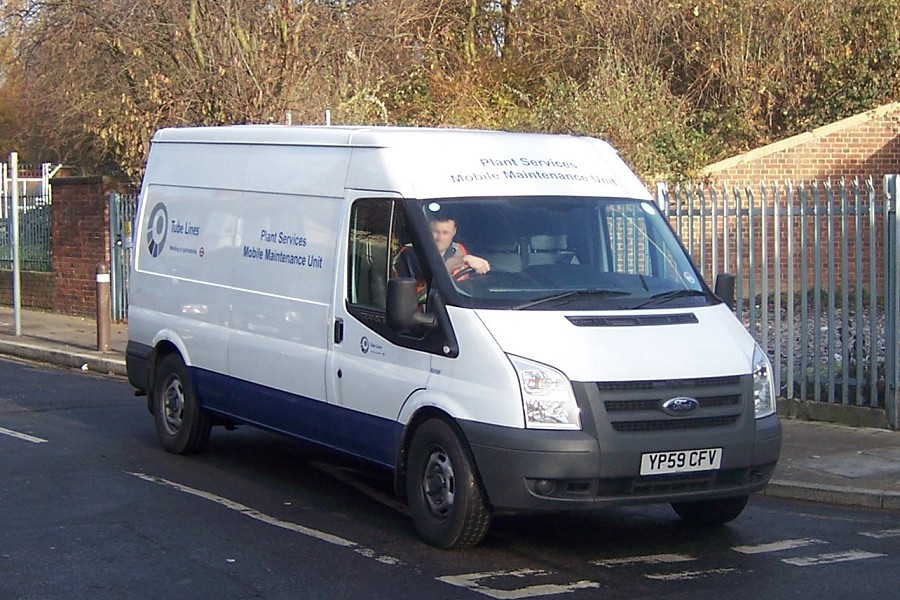 Details: Role-related lettering is very rare on tube liveried vehicles, exceptions being the Staff Welfare vans and a lone 'cleaning' van. I caught a glimpse of a van with this 'Plant Services Mobile Maintenance Unit' lettering at Lillie Bridge in spring 2010, but was unable to see its identity. However, when we got a fleetlist soon afterwards, two slightly non-standard vans were evident. 6858F and 6859F were both based on the more powerful 140 T350 Ford Transit, and were registered in Yorkshire. Most of the Staff Welfare vans were also registered in Yorkshire, having been converted by Clarks of Doncaster. I assumed that the two new vans were also some sort of conversion, but they proved to be elusive. Finally, on 13th December 2010, Ray caught one of the pair leaving Hainault Depot. Apart from the lettering it does appear to be a standard Ford Transit van. The pair are most likely based at Lillie Bridge and Ruislip depots. |