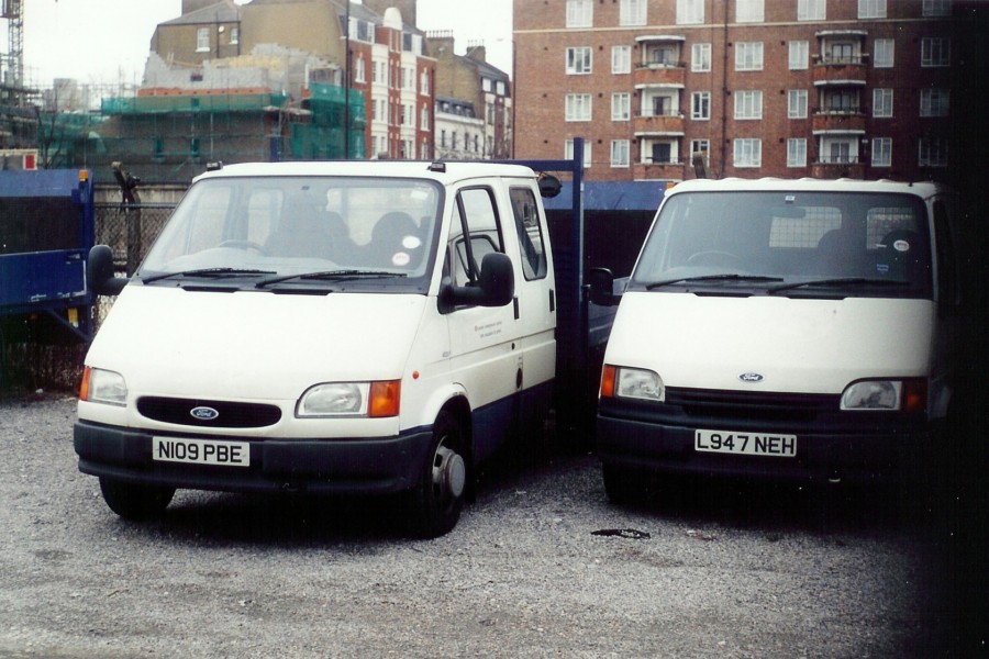 Details: The yard at Griffith House used to be a good place to find LUL service vehicles, although as of 2010 it has been closed and is being built on. This view, taken through one of the gaps in the fence in about 1996, shows at least three Ford Transits present. On the right is Mk4 van 4406F, while towards the centre is Mk5 dropside 4533F. Most of the differences between these two versions of the Transit were in the front radiator area. |