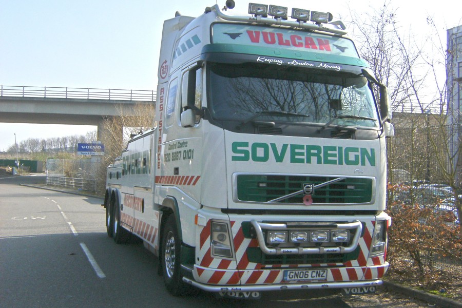 Details: A few of the recovery trucks in the Sovereign fleet have been given names, usually with military connections. Volvo FH GN06CNZ is 'Vulcan' and carries graphics of the famous delta-winged bomber. It was parked outside the Abellio Garage at Hayes on 8th March 2011. |