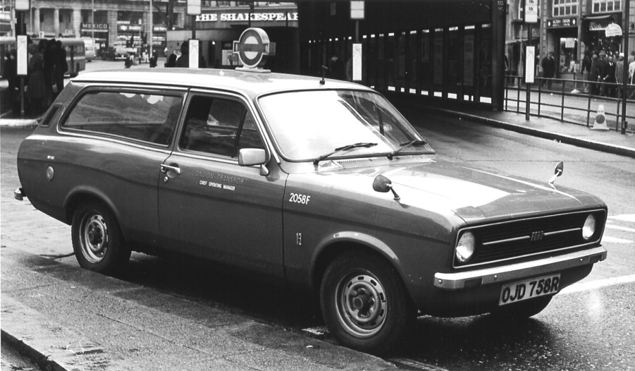 Details: Amongst the shortest-lived service vehicles were the large batches of 'radio cars' used by bus inspectors, these being replaced generally every two years. Five batches of Ford Escort estate cars saw use during the 1970s, 2058F being one of 22 new in 1977. The illuminated roof roundels were carried over from the previous batch and were thus considerably older than the cars themselves. 2058F was allocated to Victoria Garage and was photographed at the nearby bus station on 28th February 1978. Note the duplicated mirrors, and the lack of buses. |