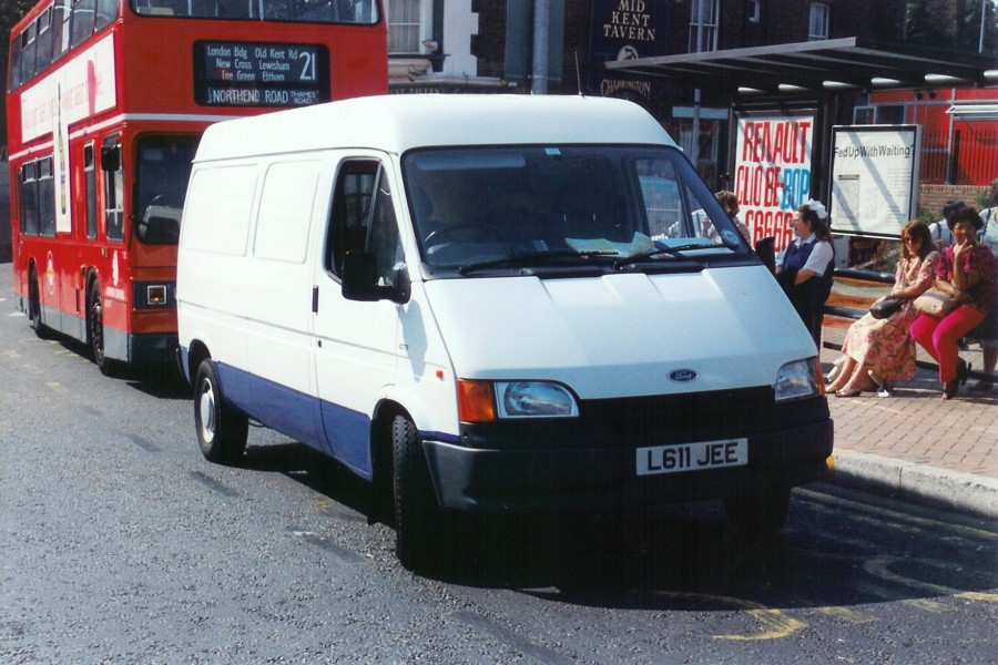 Details: 4377F was a long-wheelbase Ford Transit van new in January 1994. I don't have any information about its use or allocation, and it appears to be unlettered apart from the fleetnumbers. It does seem slightly odd to find a London Underground liveried vehicle at Lewisham however. It was photographed parked by the old bus station on 25th July 1994. And where the heck is 'Northend Road, Thames Road'? Neither are on route 21 as far as I can tell. |