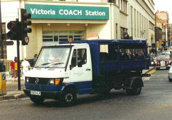 Details: Three of the six Mercedes-Benz 408Ds delivered in spring 1990 carried demountable bodies. 2479M (G925ALM) was photographed outside Victoria Coach Station on 6th September 1993 loaded with a refuse collection body. The clearance beneath the body suggests that a tipping mechanism may be fitted, while part of the sides are enclosed by mesh panels. The roof is canvas. |