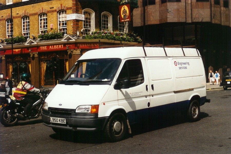 Details: 4424F was another long-wheelbase Mk4 Ford Transit van, new in July 1994 and lasting for almost exactly 6 years. The cabside lettering reads 'London Underground Limited Signal, electrical & communication services'. When new, the titling had been 'Signal & electrical contractors'. Photographed on Victoria Street on 3rd June 1998. |