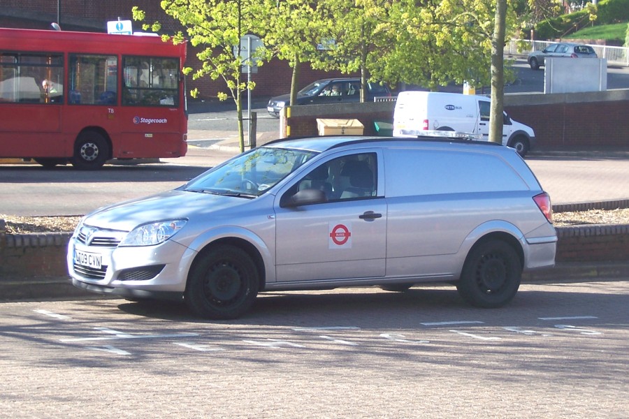 Details: Although only marked with temporary-looking labels on the doors, this Vauxhall Astra van is officially number 6793V in the leased fleet. New in 2009, it was not seen until 8th April 2011, when Ray found it paying a visit to Eltham Bus Station. The role and allocation of this vehicle remains unknown. Note the low-profile light-bar and the lack of wheeltrims. |