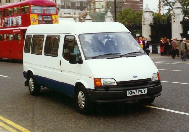 Details: For some time most Ford Transit service vehicles have been leased rather than owned, and are therefore numbered in the 3000+ range. Four minibuses received in late 1992 were purchased however, including 15-seat 2506F (K157PLY). Photographed in Parliament Square on 29/9/1994, the smart wheeltrims and lack of lettering are notable. |