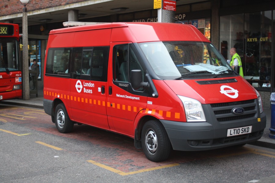 Details: Fleetnumber 6853F is one of two Ford Transit minibuses new for the London Buses Passenger Data team in March 2010. It was photographed at Southgate Station on 25th March 2011. Note the local fleetnumber applied to the bumper using stickers. Because two '10' registered minibuses were received, these are known internally by the last two digits of their central fleetnumbers (52 and 53). |