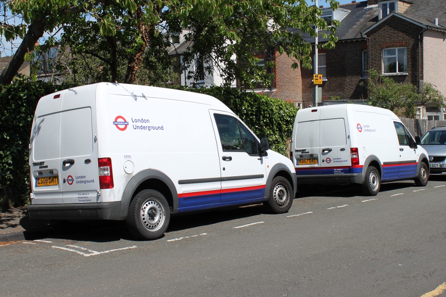 Details: Kim found a pair of London Underground vans parked on Highlands Road, Northwood, on 9th May 2011, near to a bridge on the Metropolitan Line. Apart from both being the slightly rarer long-wheelbase Ford Transit Connect, the pair is notable for having slightly different liveries. On 6432F in front, the blue skirt is carried up to the rubbing strip, and is consequently continued around the rear. 6486F has a lower skirt (a mini-skirt?) on the sides only. |