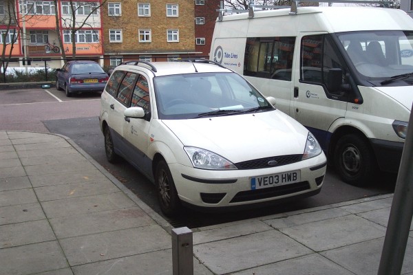 Details: Ford Focus Estate Car 5503F (VE03HWB) carries Tube Lines markings on standard livery. Alongside in this February 2004 view at Acton is Ford Transit 300 Crew Van 5426F (KJ03DXT). |