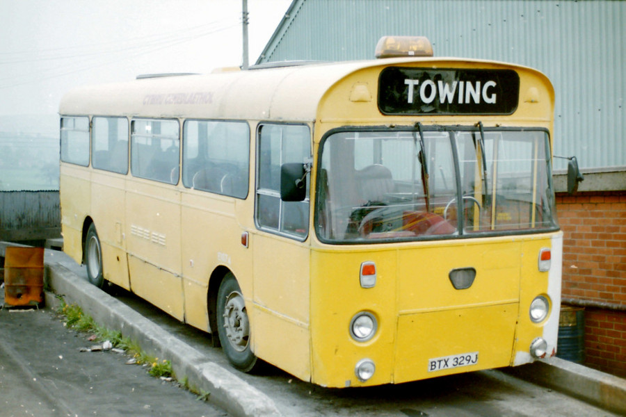 Details: The practice of converting old buses into towing vehicles remained popular outside London until the 1990s at least. Here is the first of two very similar-looking Welsh examples. New to Western Welsh (later National Welsh) in 1971, this Leyland Leopard with Willowbrook bodywork was converted into towing bus E1074 during the 1980s. It was based at Aberdare depot until being sold in 1992. National Welsh itself went into receivership that year. Note that the offside fleetname is in Welsh. |