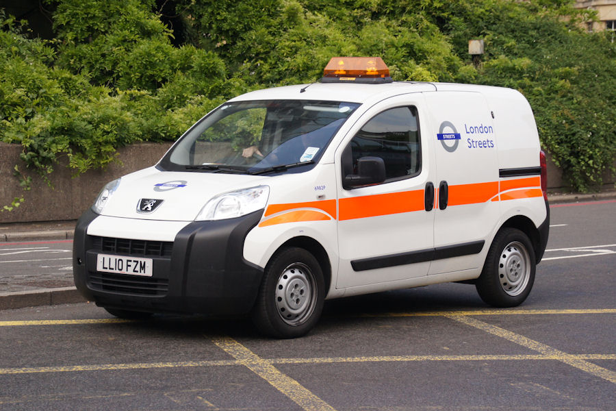 Details: The five Peugeot Bipper vans with TfL Streets can often be seen around central London, although 6983P has yet to be photographed. On 4th July 2011, Graham caught 6982P rounding the IMAX cinema at Waterloo. Instead of the usual LED light-bar, this example has a detachable roof light. |