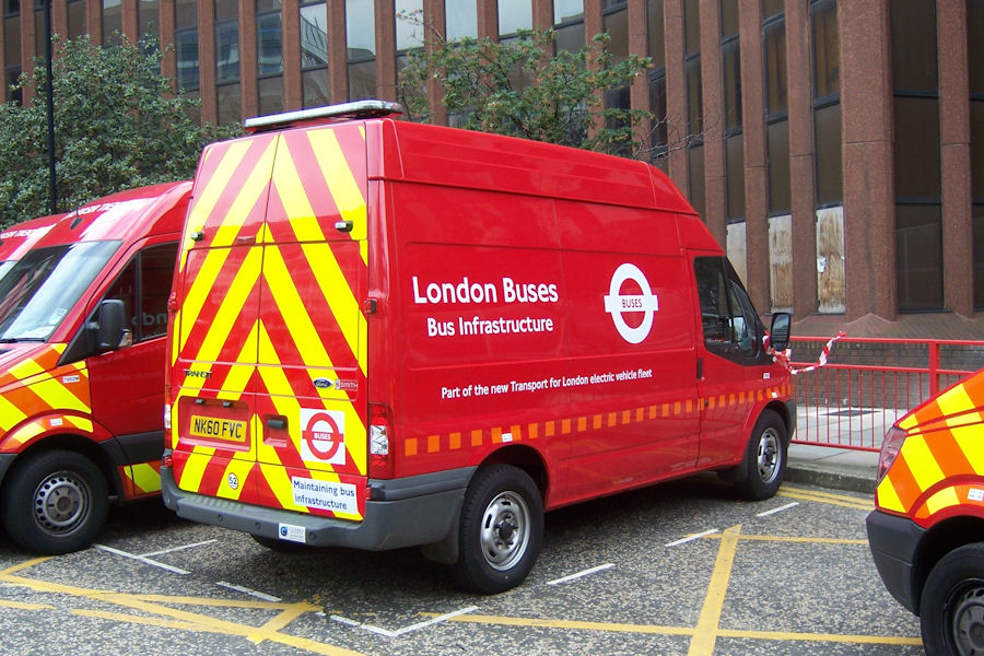 Details: Although ordered in late 2010, and first licensed in February 2011, the first two Smiths electric vans for LBSL did not enter service until August 2011. As this photo shows, the vehicles are based on (and licensed as) Ford Transit vans. As well as Smiths labels, the rear has a sign for bodywork convertor Clarks, who were responsible for most of the staff welfare vans in the fleet. Although we had speculated that these vans would carry fleetnumbers 6987F and 6988F (to follow on from the Ashwoods conversions 6985F and 6986F), the first was given the surprisingly high number of 7160F. It was initially allocated to Aldgate Bus Station, where it was photographed on 6th August. Note the livery is the orange squares variant as carried by most Infrastructure vans. However, a change is the inclusion of large Buses roundels, as seen on most recent new bus deliveries. I'm not sure why the van has been tied to the railing with incident tape! Perhaps to stop staff driving it away while it is still plugged in?! |