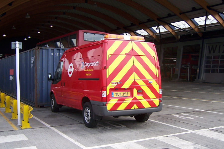 Details: Stagecoach London has recently been renewing its engineer's van fleet. Unlike the crew ferry minibuses, the new vans have been given full Stagecoach lettering, and they also carry their Stagecoach national fleetnumbers. Photographed (with permission) in West Ham Garage on 6th August 2011, YC11JYJ is number 95250. Note the large Buses roundel towards the front (slightly smaller than the ones on LBSL 7160F) and the descriptive side lettering. |