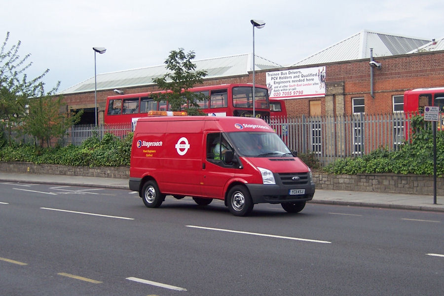 Details: YC11KSJ is the new Stagecoach Fleet Engineers van at Catford (does exactly what is says on the side of the van!). It was photographed outside its home base on 3rd August 2011. The fleetnumber is in yellow, low down on the side and unfortunately could not be made out from this photo. |
