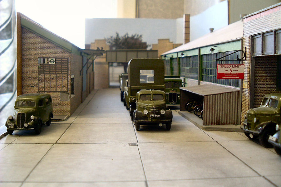 Details: The roadway between the main buildings at Parsons Green Works was often packed full of service vehicles, as seen in this 1962 photograph. Clive's superb 4mm scale model of the works makes some compromises in terms of size but still captures the essence of the location. |