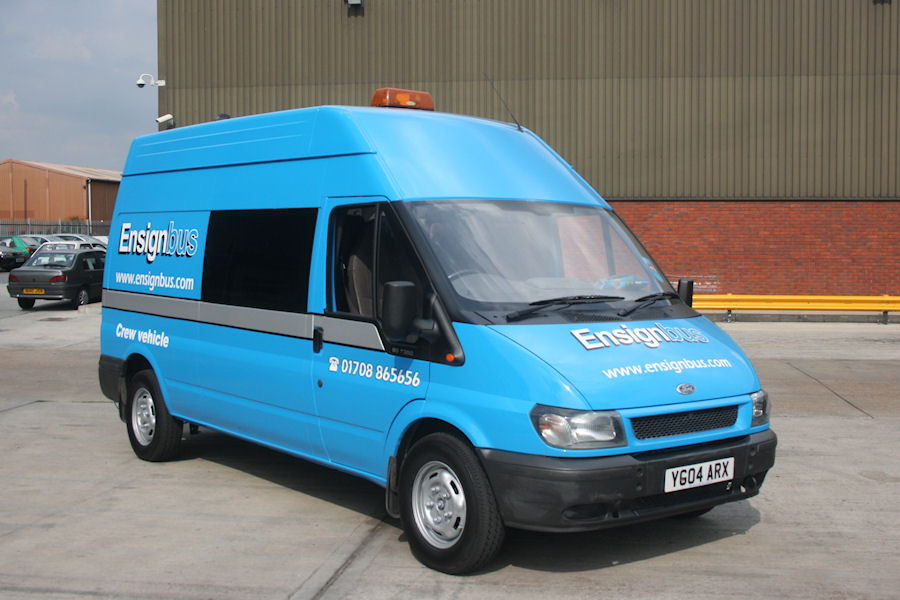 Details: Having been an anonymous member of the Ensignbus fleet for almost a year, high-roof Ford Transit van YG04ARX was treated to a repaint in August 2011. It was photographed at Purfleet garage on the 3rd of that month. Note that the lettering shows it to be a crew vehicle. |