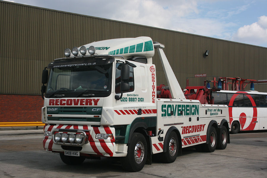 Details: Acquired from MTS of Scotland in late 2010, SN08KWG is unusual in the Sovereign Recovery fleet for being 4-axle. Based on a DAF CF, it was photographed at Ensign's Purfleet premises on 19th August 2011. |