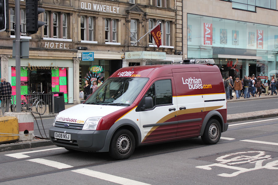 Details: The Lothian Buses fleet has featured on this site before (in 2008), but the company has evidently changed its livery again. This rather stylish maroon (sorry, 'madder'), gold and white scheme was worn by Ford Transit Connect van EA08NSJ, photographed on Princes Street on 19th July 2011. Note the tracks for the much-delayed tram scheme. A similar van was photographed bearing Routemaster registration WLT752. |