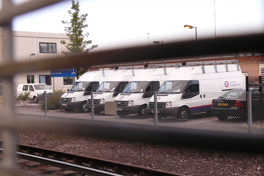 Details: Only a small part of Hainault Depot is visible from the 'outside', this being a parking area visible from a turning off Trotwood. However, there are the usual multiple fences to contend with. This view taken on 1st September 2011 shows a neat line up of four high-roof Ford Transit vans. Oddly all four are from different batches, with different year registrations. From the right they are 6979F, 6660F, 6958F and new 7137F. The latter appears to lack the roof-mounted tube carried by the other trio. On the far left is Volkswagen Transporter crew van 7078VW. |