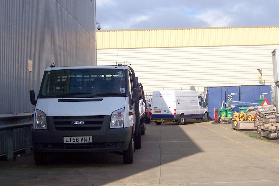Details: A recent addition to the locations list on this website, North Crescent is a depot that was originally operated by Grant Rail (see here) but which is now run by Tube Lines. North Crescent is a turning off Cody Road, close to the new West Ham bus garage. The depot has a large shed, with an internal road on three sides (the fourth side being North Crescent itself). The south and north ends of this road can be seen from the two gates, although it is likely more vehicles are hidden on the west side. Ray took this photo from the north gate on 5th September 2011. To the fore is Ford Transit dropside 6570F. As already reported, this vehicle recently lost its Tube Lines logos, although its appearance here suggests it is still operated by them. Parked behind is another dropside, most likely 6386F, while in the distance is Transit van 6858F. The latter is one of two vans marked up as Mobile Maintenance Units for the Plant Services section. As can be seen, a tow-bar is fitted. |