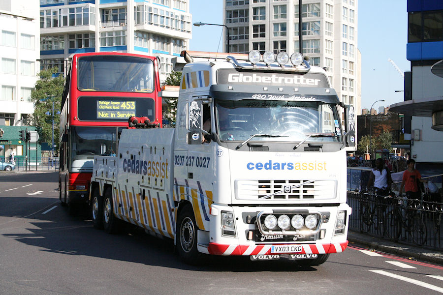 Details: More tow truck 'bling', photographed at Elephant and Castle on 30th September 2011. Cedars are one of several companies that share London bus recovery work with Sovereign (last being shown on this site back in 2006). Their fleetnumber 27 is VX03CK, a Volvo FH 3-axle recovery unit which is apparently a '420 With Attitude'! Note also the Volvo logos and saucy etchings on the chrome mirror covers. The bus was Camberwell's PVL315, one of several temporarily being used on route 453. This route was converted from bendy-buses on 24th September, but not all the Enviro 400 buses had been delivered in time. To provide cover, newly delivered Volvo/Wright buses intended for route 12 were used on route 45, releasing PVLs for use on the 453! It is barely visible in this resized photo, but the dot in the sky to the right is a Chinook helicopter. |