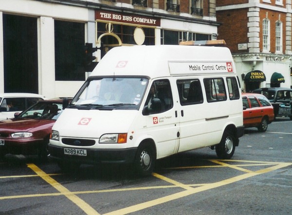 Details: This Ford Transit van was used as a Mobile Control Centre at incidents and events which affected central London bus services. 4687F (N289KCL) was a high-roof, long-wheelbase Transit 190 new in July 1996, and later replaced by red-liveried 5040F. |