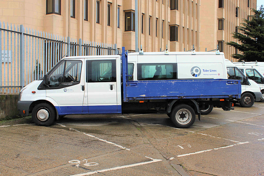 Details: A slightly odd coincidence was that the only broadside shot in the batch sent by Kim should be of a vehicle without a fleetnumber. However, there are only two Tube Lines Ford Transit dropside trucks at Lillie Bridge, and only one of them has a crew-cab. Comparison with earlier photographs (in particular the various scrapes on the bodysides) proves that this is 6281F. This had earlier carried the incorrect fleetnumber 6218F on the nearside, which has evidently now been removed but not yet replaced. Given that the vehicle is over 4 years old, they probably won't bother. Photographed at Lillie Bridge on 26th October 2011. |