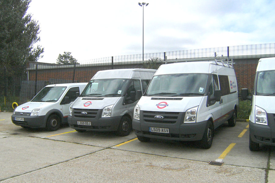 Details: Today's photos include a couple taken on 12th September 2011 inside the Westdown Road base in Leyton. The first shows two of the regular Ford Transits (silver minibus 6819F and white/blue crew van 6778F) along with Ford Transit Connect 6318F. The latter van seems to divide its time between Hainault Depot and here. |