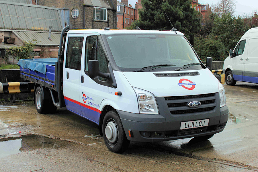 Details: 7111F is a recent Ford Transit dropside truck in London Underground livery and based at Lillie Bridge (where it was photographed on 26th October 2011). This example has a crew-cab but no tail-lift. |