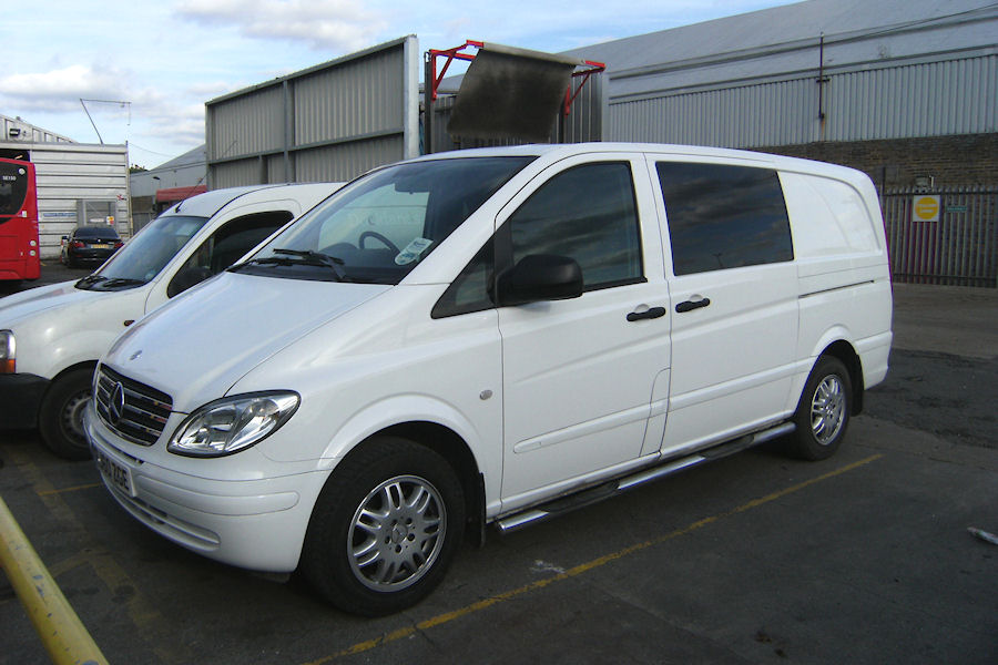 Details: The Silvertown Garage used by Docklands Buses has seen an increase in work recently, with several route tenders won, and a large allocation of new Enviro 200 buses. Crew ferry duties are performed by anonymous Mercedes-Benz Vito crew vans, including white RJ60ZGE photographed at the garage on 29th October 2011. Alongside is Renault Kangoo van GY03PFG, based here since 2008 but not seen in use recently. |