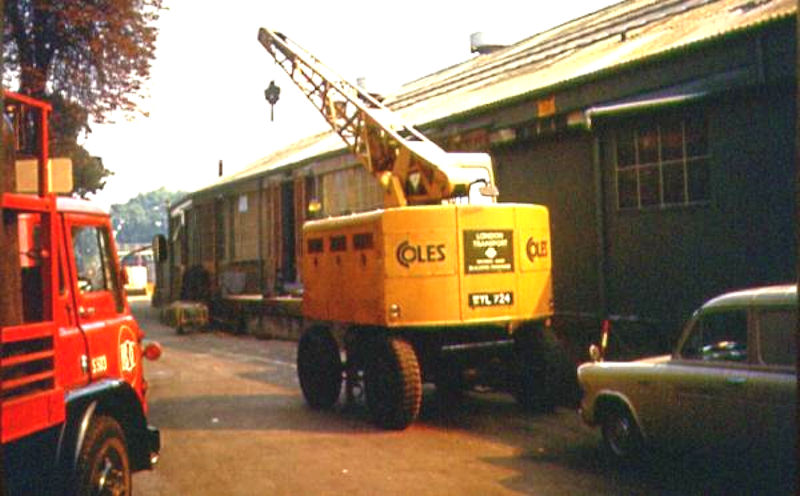 Details: WYL724 was one of two road-registered Coles mobile cranes operated by London Transport. New in 1959 it spent many years at Parsons Green depot, where it was photographed on 20th September 1966. This photograph usefully shows that the livery was yellow. A photo was published in SUP22 (an LT registrations list produced by LOTS in 1981) but was in black and white. The crane lasted until at least 1977. Also visible are one of the Ford Thames 7-cwt vans, and a Bedford TK lorry in what looks like BOC livery. |