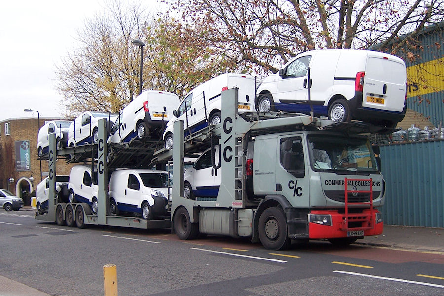 Details: Yet another case of Ray being in the right place at the right time. On 28th November 2011 he paid a visit to Bollo Lane and found this transporter lorry parked opposite the works entrance. Loaded on board were no fewer than 9 brand new Peugeot Bipper vans, all in unmarked white/blue livery. New vehicles are usually driven to Acton Works for commissioning, although Ray has seen old vehicles departing by transporter in the past. |