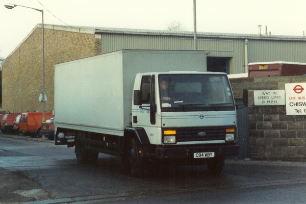Details: Four Ford Cargo Box Trucks were bought between 1983 and 1986, including 2441F (C94WBY), a Cargo 1011 with Tail Lift. When photographed leaving Chiswick Works it was carrying the blue and black stripes adopted by some Distribution Services vehicles in the late 1980s. |