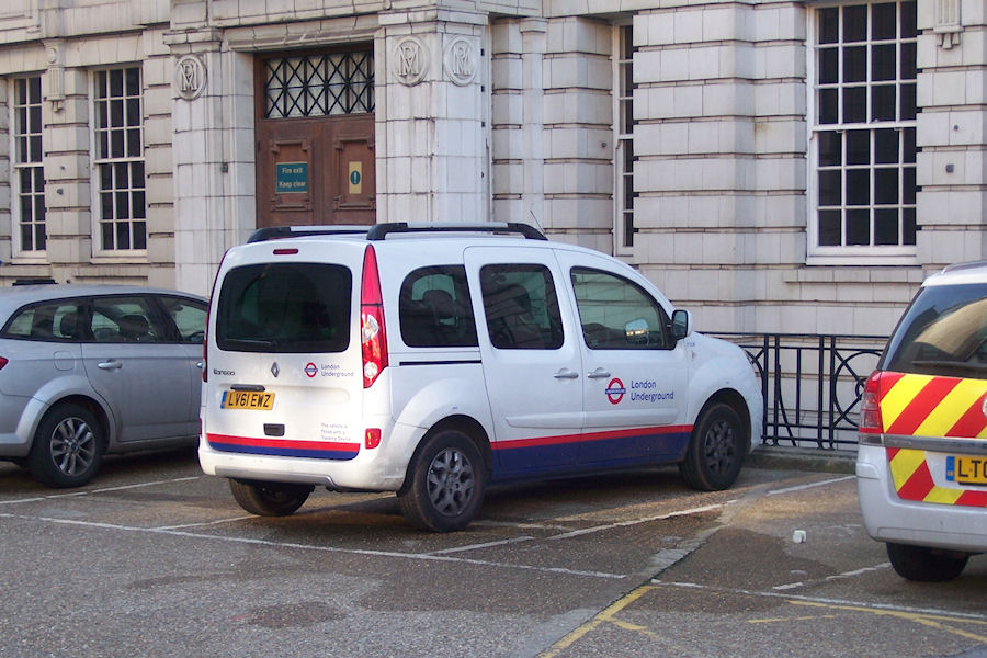 Details: Renault Kangoo estate car 7132R was delivered in November 2011, seemingly as a replacement for similar 6543R. As such it is based at the LUL offices on Allsop Place, behind Baker Street Station. It was photographed at home on 14th January 2012 parked with fellow resident 6713V. Compared to similar 6992R (also photographed here), 7132R has roof-bars and white bumpers and rubbing strips (instead of black), changing the appearance considerably. |