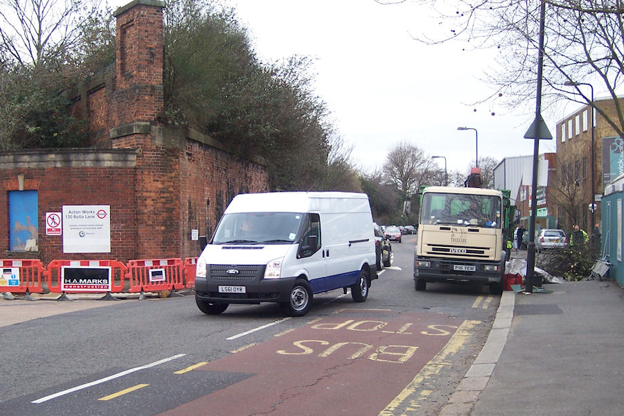 Details: Although Ford has been losing out in central fleet orders for smaller vehicles (mainly going to Renault, Volkswagen and Peugeot instead), the Transit remains the dominant model for larger vehicles. Photographed being delivered to Acton Works on 9th January 2012, LS61OYR is a long-wheelbase mid-height van. Pedestrians would have had problems here, with both pavements seemingly blocked. |